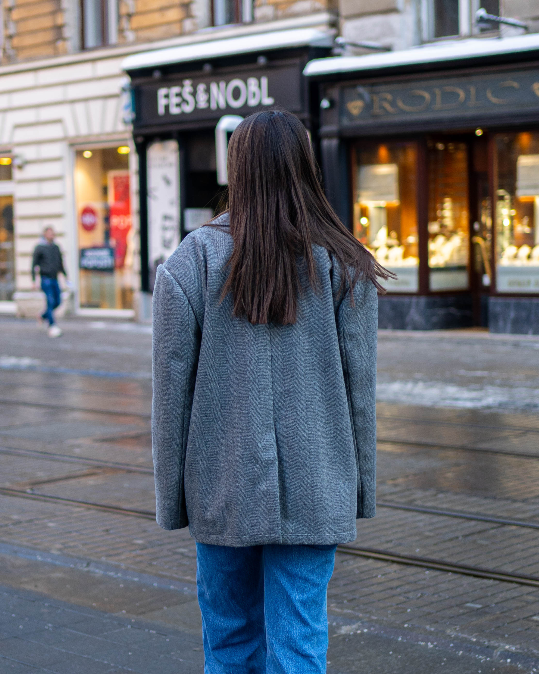 Midnight Embrace blazer izrađen je od 80% vune i 20% kašmira. Kroj je oversized, s ravnim linijama koje stvaraju opušten izgled. Lako se uklapa u dnevne i večernje kombinacije.