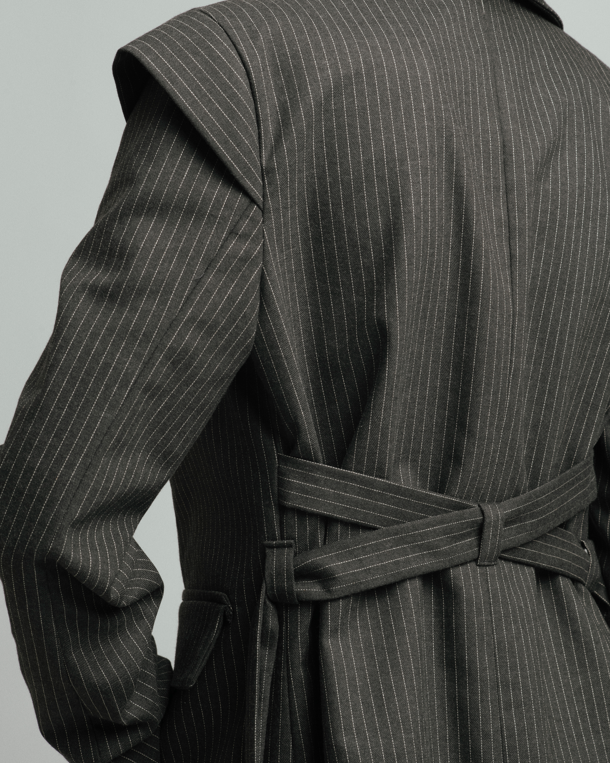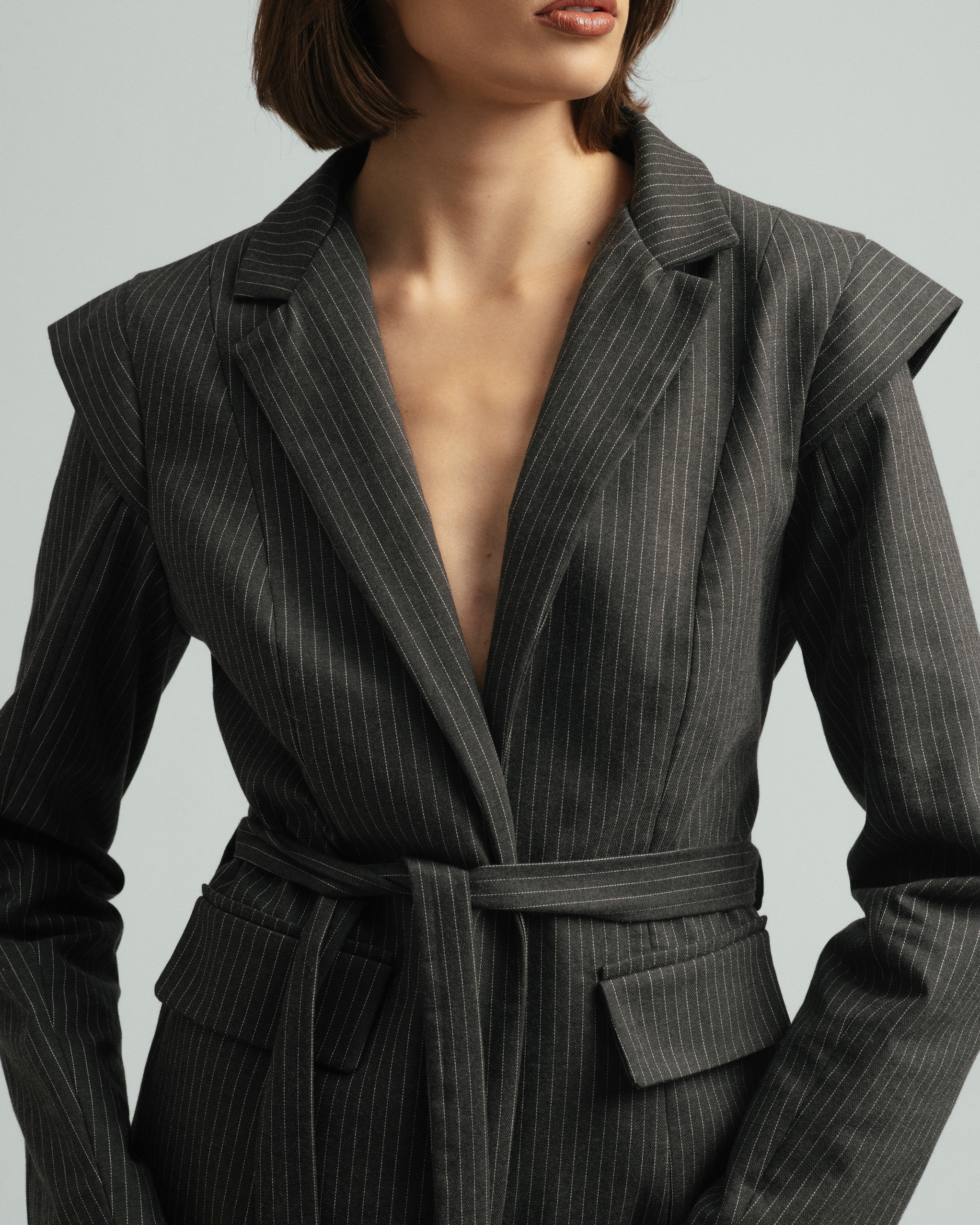 Shadow Blazer izrađen je od 100% vune. Ima ravnu, strukturiranu siluetu s naglašenim ramenima i pojasom. Suptilne pruge daju mu moderan, uredan izgled, zbog čega se lako uklapa u poslovne i večernje kombinacije.