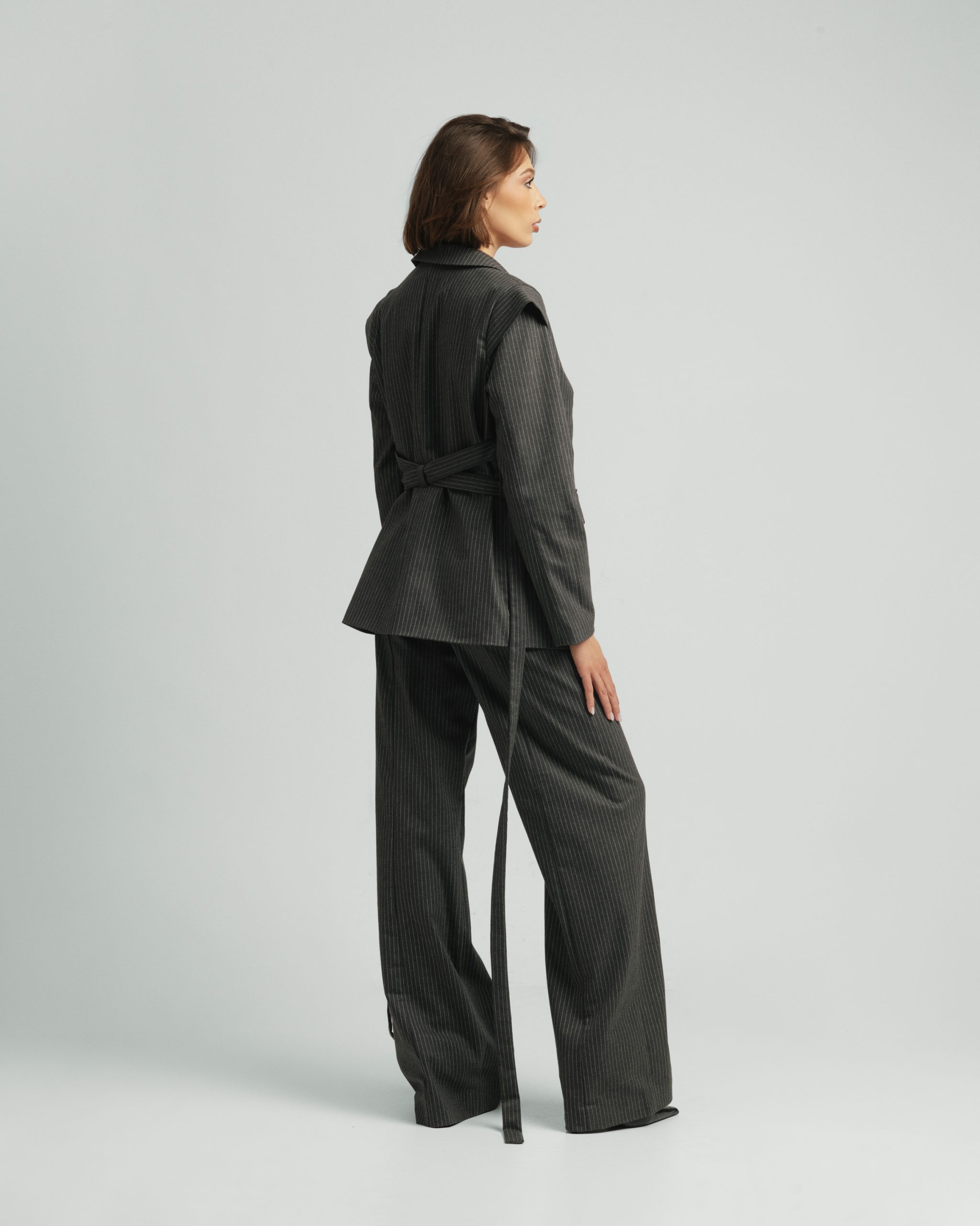 Shadow Pants izrađene su od 100% vune i krojene u ravnoj, blago izduženoj liniji koja vizualno produžuje figuru. Suptilni prugasti uzorak dodaje dozu suvremenosti, a jednostavan kroj omogućuje lako kombiniranje s blazerima, košuljama ili ležernijim gornjim dijelovima.
