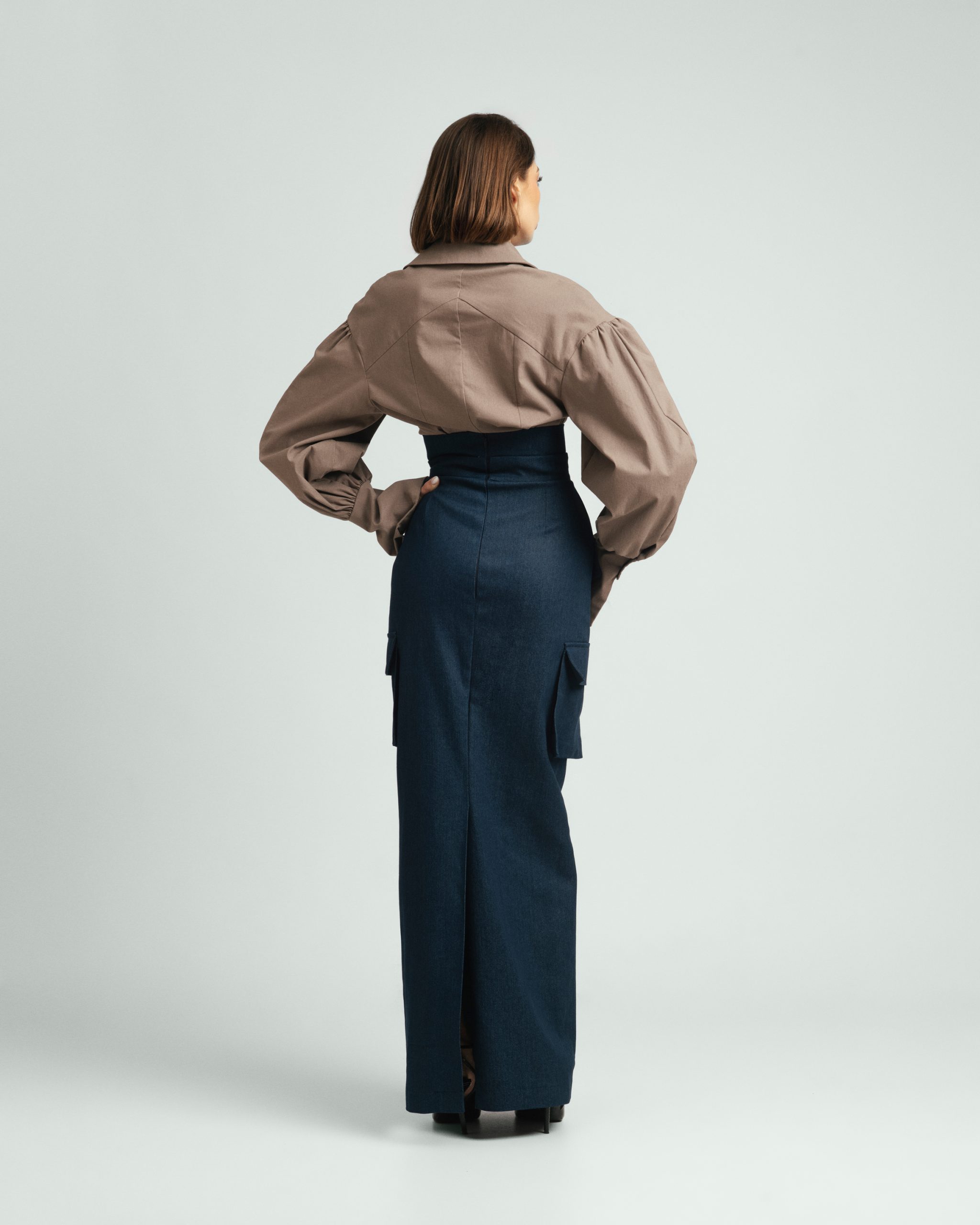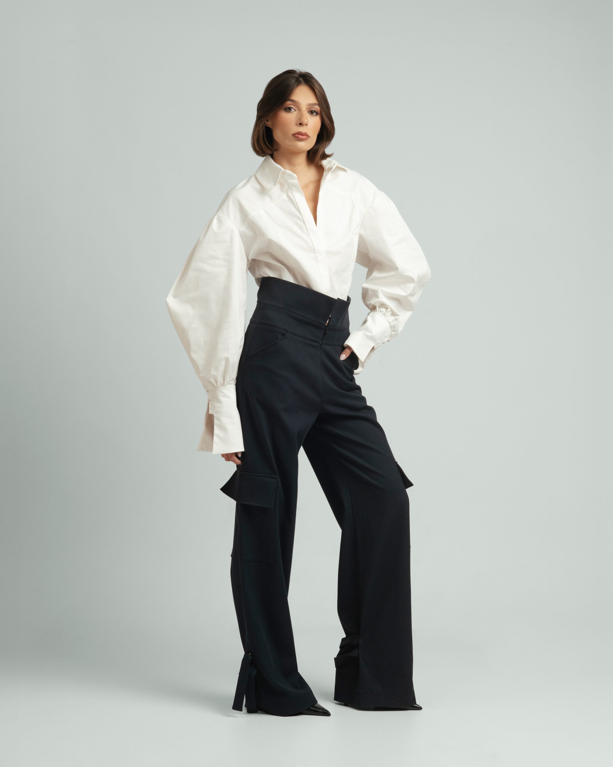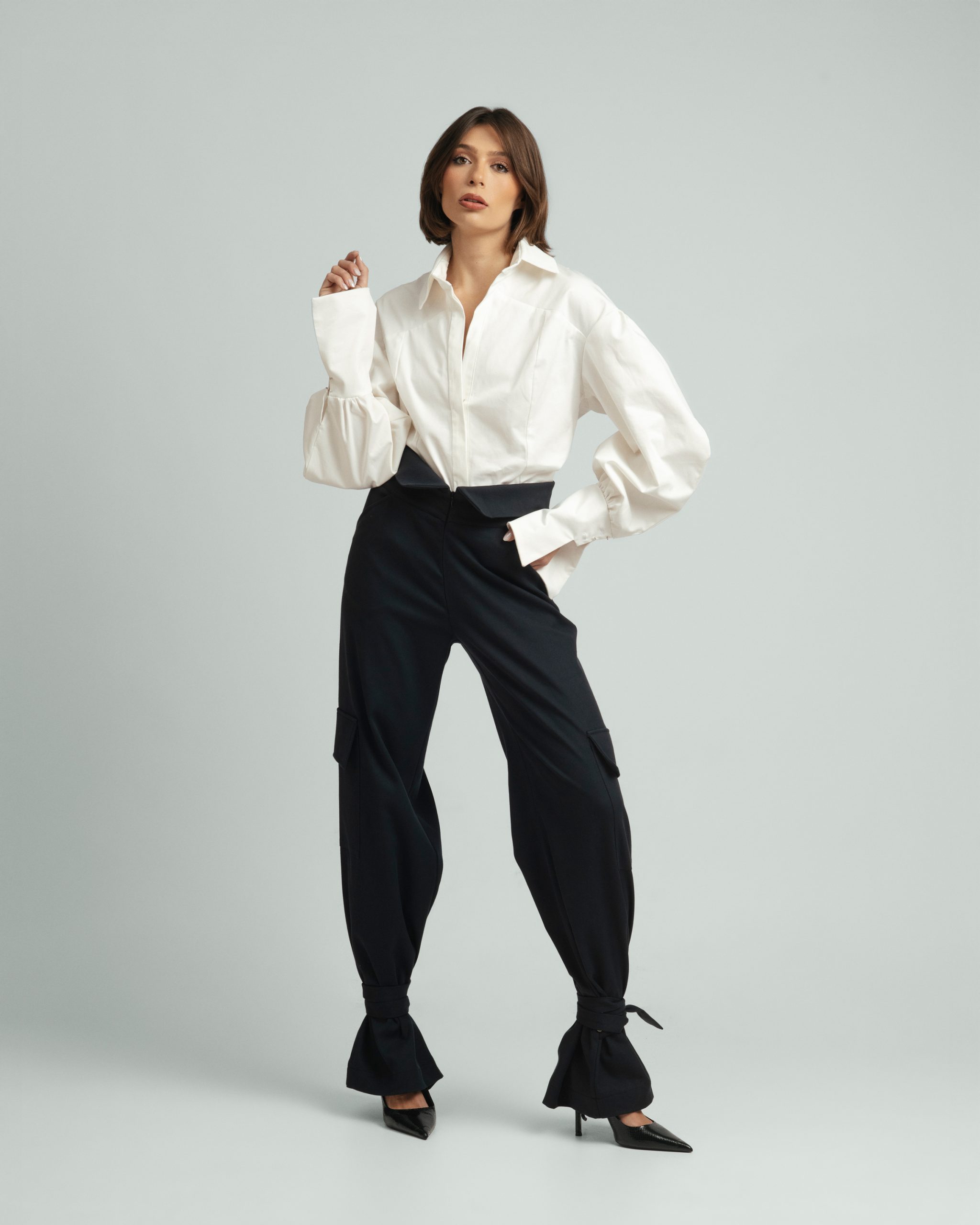 Urban Frame košulja opuštenog je kroja, s naglašenim ramenima i voluminoznim rukavima koji stvaraju uravnotežen oblik. Linija ovratnika i precizni nabori naglašavaju strukturu, dok pad tkanine unosi lakoću pokreta. Spoj forme i stava daje joj karakter koji nenametljivo privlači pogled.