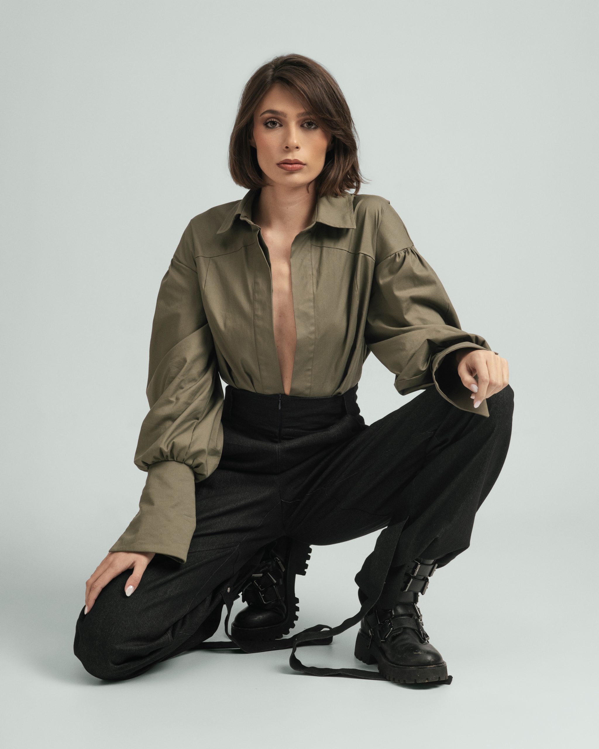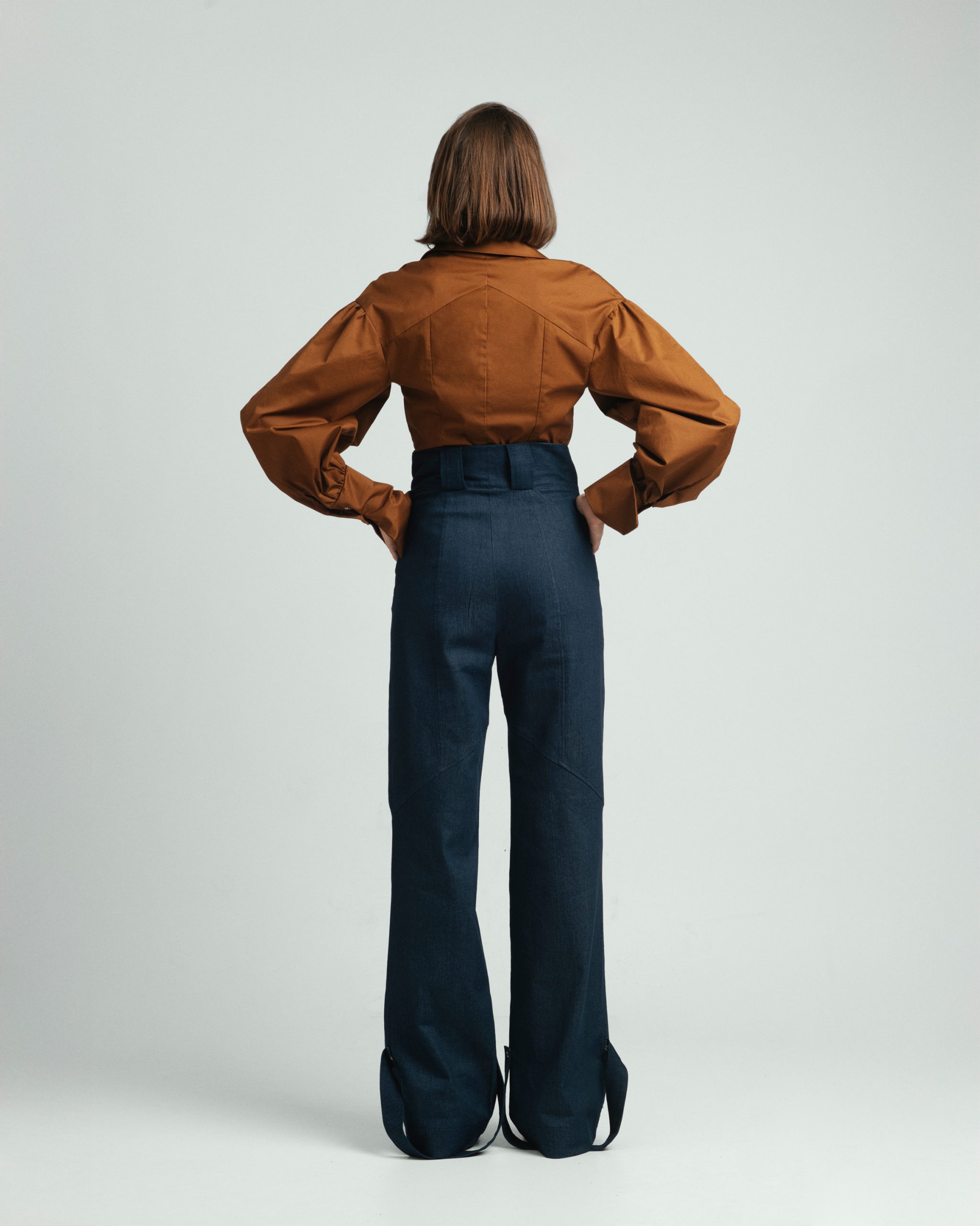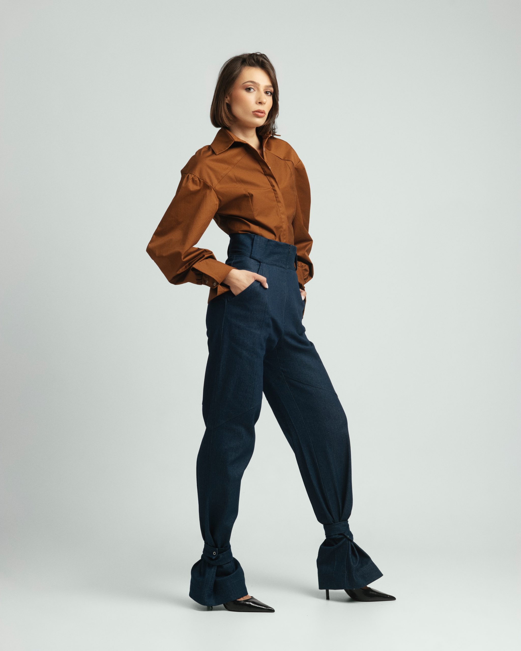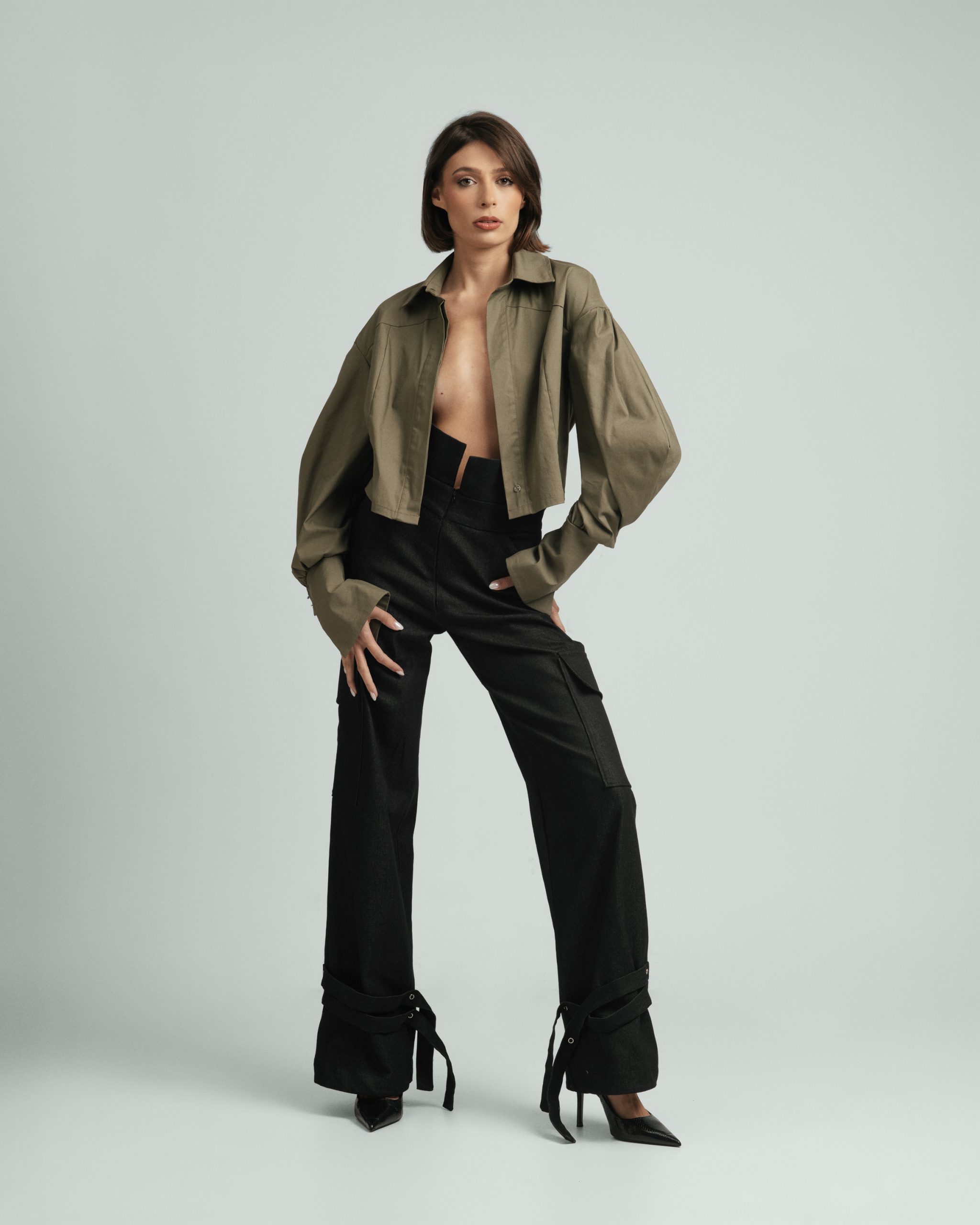 Urban Frame košulja opuštenog je kroja, s naglašenim ramenima i voluminoznim rukavima koji stvaraju uravnotežen oblik. Linija ovratnika i precizni nabori naglašavaju strukturu, dok pad tkanine unosi lakoću pokreta. Spoj forme i stava daje joj karakter koji nenametljivo privlači pogled.